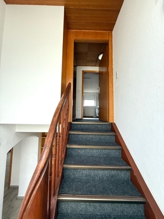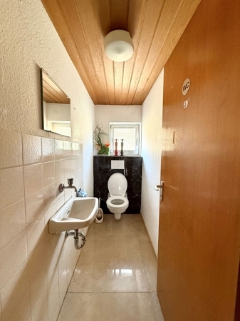 Zudem befindet sich neben dem großzügigen Wohnbereich ein Gäste-WC. Das Obergeschoss bietet Zugang zu einem Balkon.