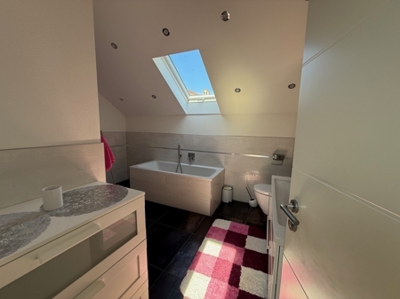Im Erdgeschoss befinden sich die Diele, ein großzügiges Wohnzimmer mit Pelletofen, ein Esszimmer, ein Schlafzimmer, eine Küche mit moderner Einbauküche und direktem Zugang zur Terrasse sowie ein Duschbad mit WC und Fenster. Das Obergeschoss umfasst drei Schlafzimmer, von denen eines einen Zugang zum Balkon bietet, ein kleines Büro, ein helles Tageslichtbad mit Dusche und Badewanne sowie zwei weitere WCs. Alle Räume sind lichtdurchflutet und sorgen für eine angenehme Wohnatmosphäre.